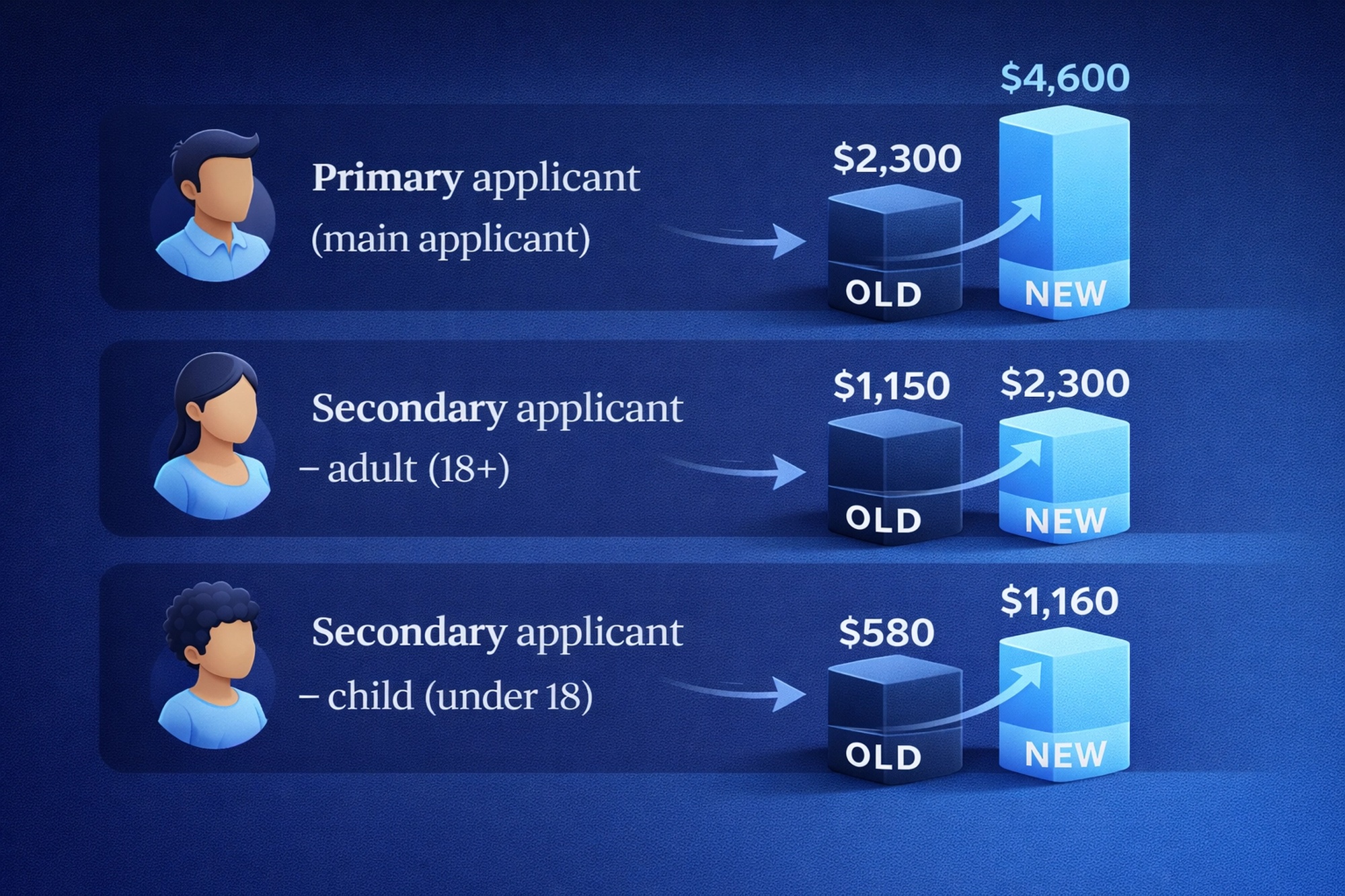 For a single applicant, the upfront government charge is now $4,600. For a couple applying together, that is $6,900. Add one child and you are looking at $8,060 — before health insurance, police checks, medical examinations, or any migration agent fees.
