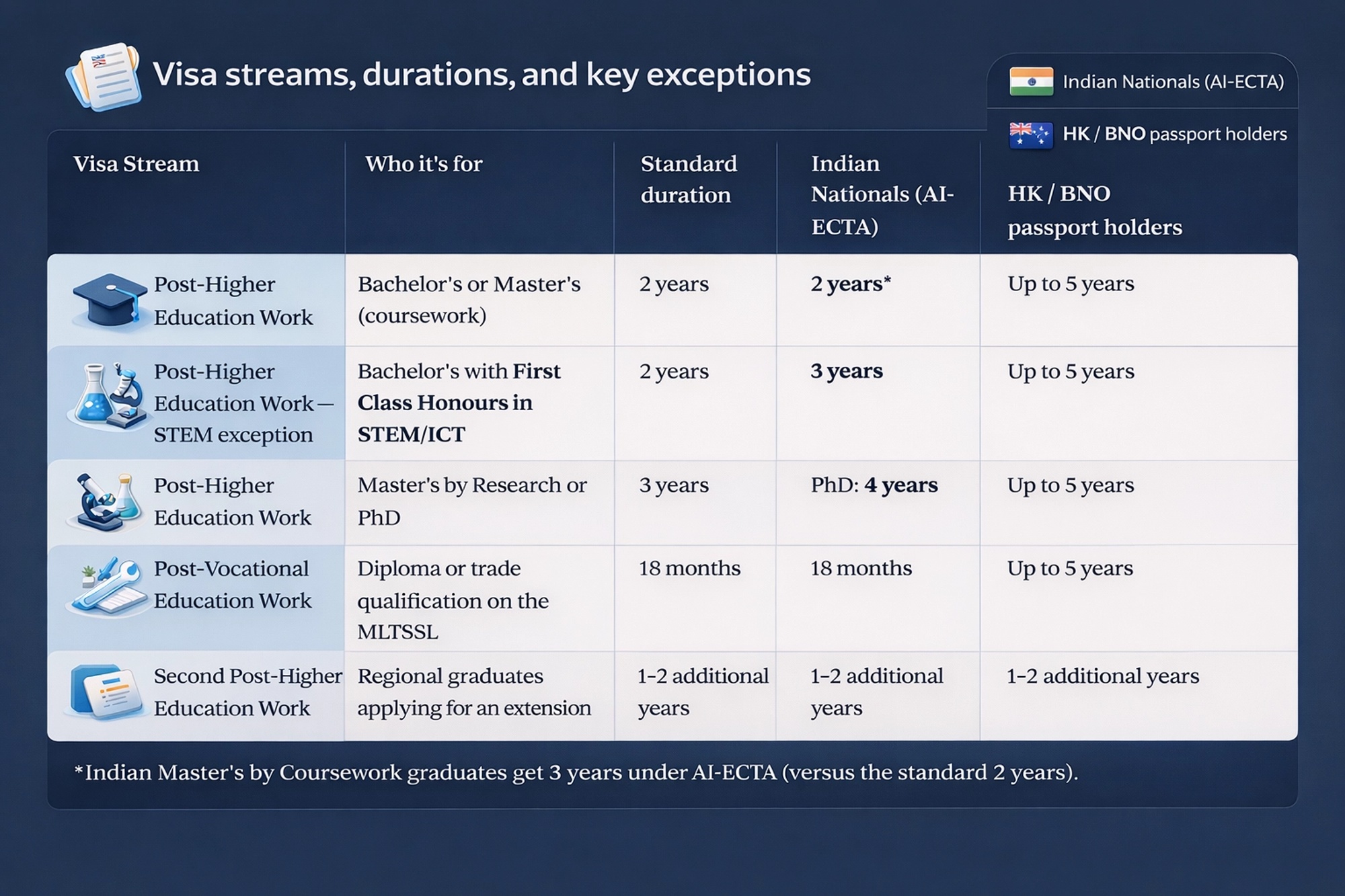 A note for Indian graduates: Under the Australia-India Economic Cooperation and Trade Agreement (AI-ECTA), Indian passport holders are entitled to extended stay periods for certain qualifications. The most notable benefit is for graduates with a Bachelor's degree with First Class Honours in a STEM or ICT field (3 years instead of 2), Master's by Coursework graduates (3 years instead of 2), and PhD graduates (4 years instead of 3). These extended durations are applied at the time of visa grant based on your passport and qualification — you don't need to do anything special to claim them. Always confirm the applicable duration with a MARA-registered migration agent for your specific qualification and circumstances.