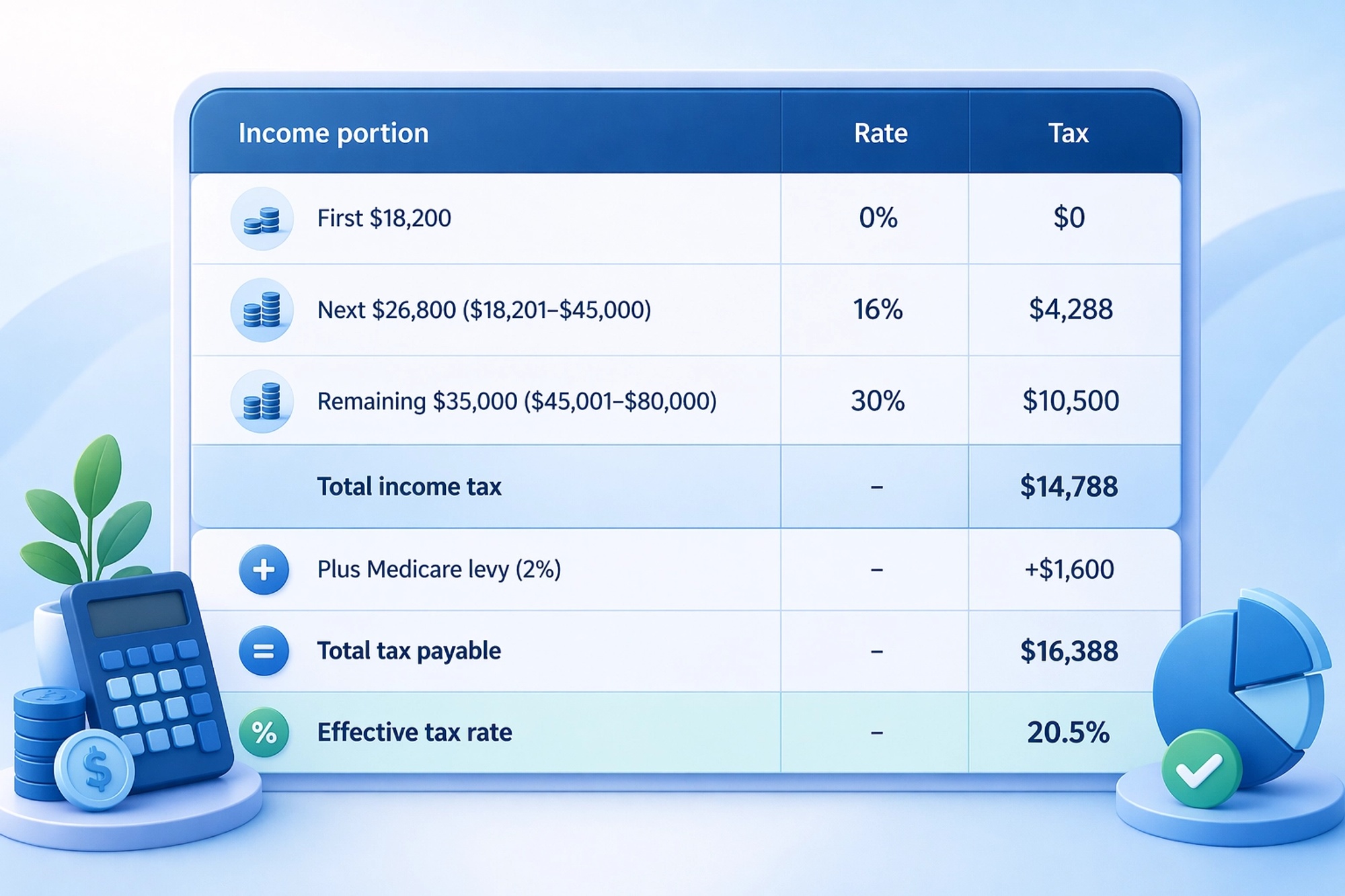 Once your tax residency is established, there are three tax categories that apply to individuals in Australia: