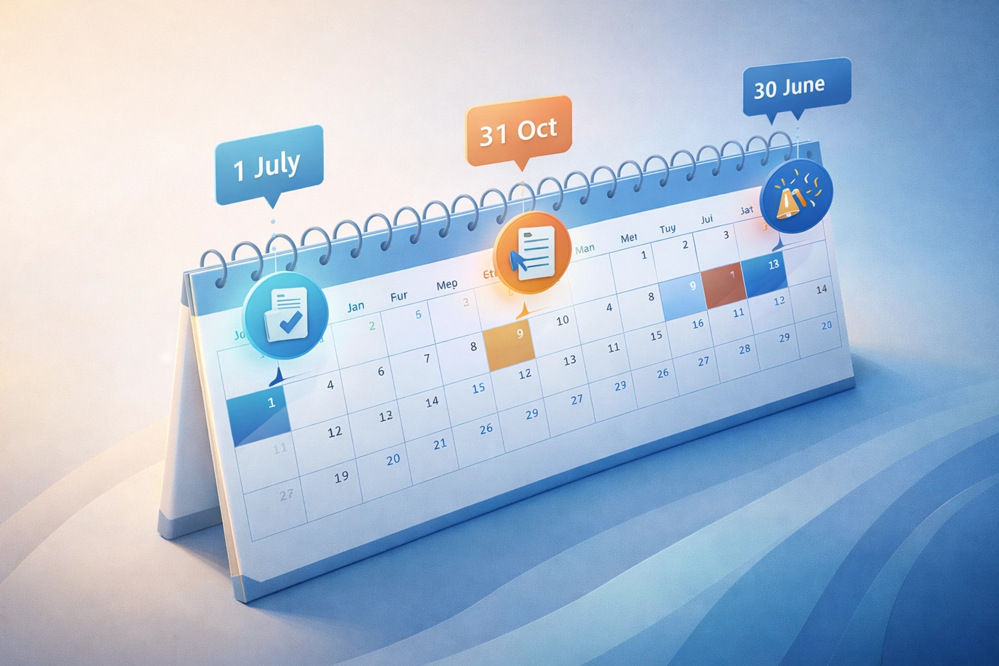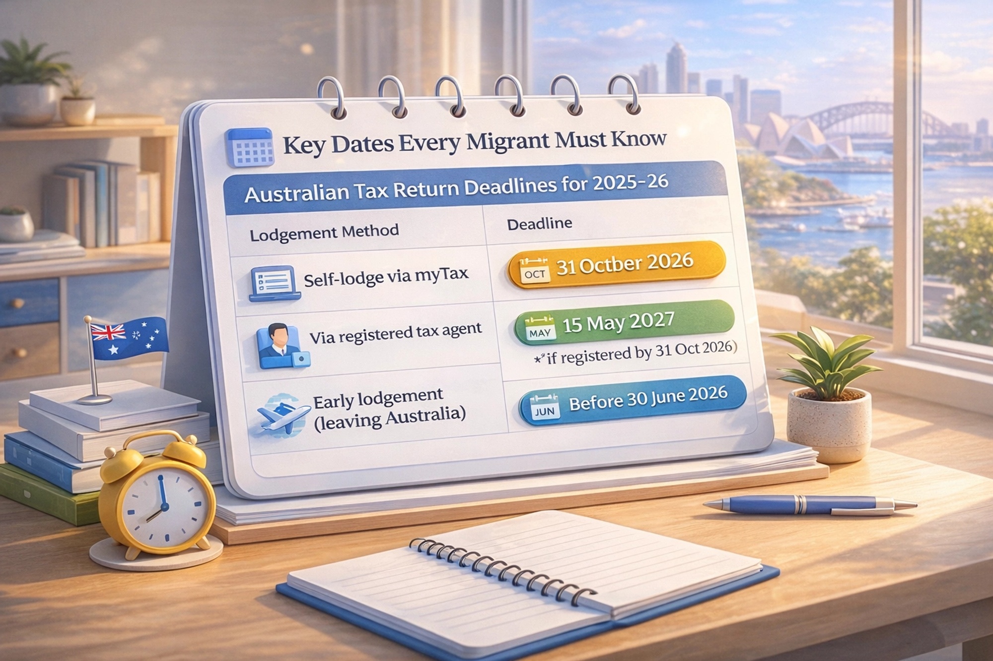 SettleMate's Tip: SettleMate recommends marking 30 June and 31 October in your calendar on the day you arrive. EOFY (30 June) is when the financial year closes — any deductible purchases, super contributions, or tax planning decisions must happen before this date to count. 31 October is the lodgement deadline. Missing either date has financial consequences. Set reminders from Day 1.